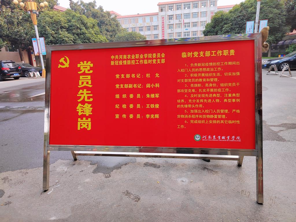 一个支部就是一座堡垒,一名党员就是一面旗帜。面对当前严峻的疫情防控形势,我院积极行动,深入贯彻“疫情要防住、经济要稳住、发展要安全”的重大要求,于11月7日同中牟县教育局联合成立了中共河南农业职业学院委员会新冠疫情防控工作临时党支部,从严从紧从细从实做好疫情防控工作,守好出入学校第一道关,扛起防控疫情和服务师生的重任。