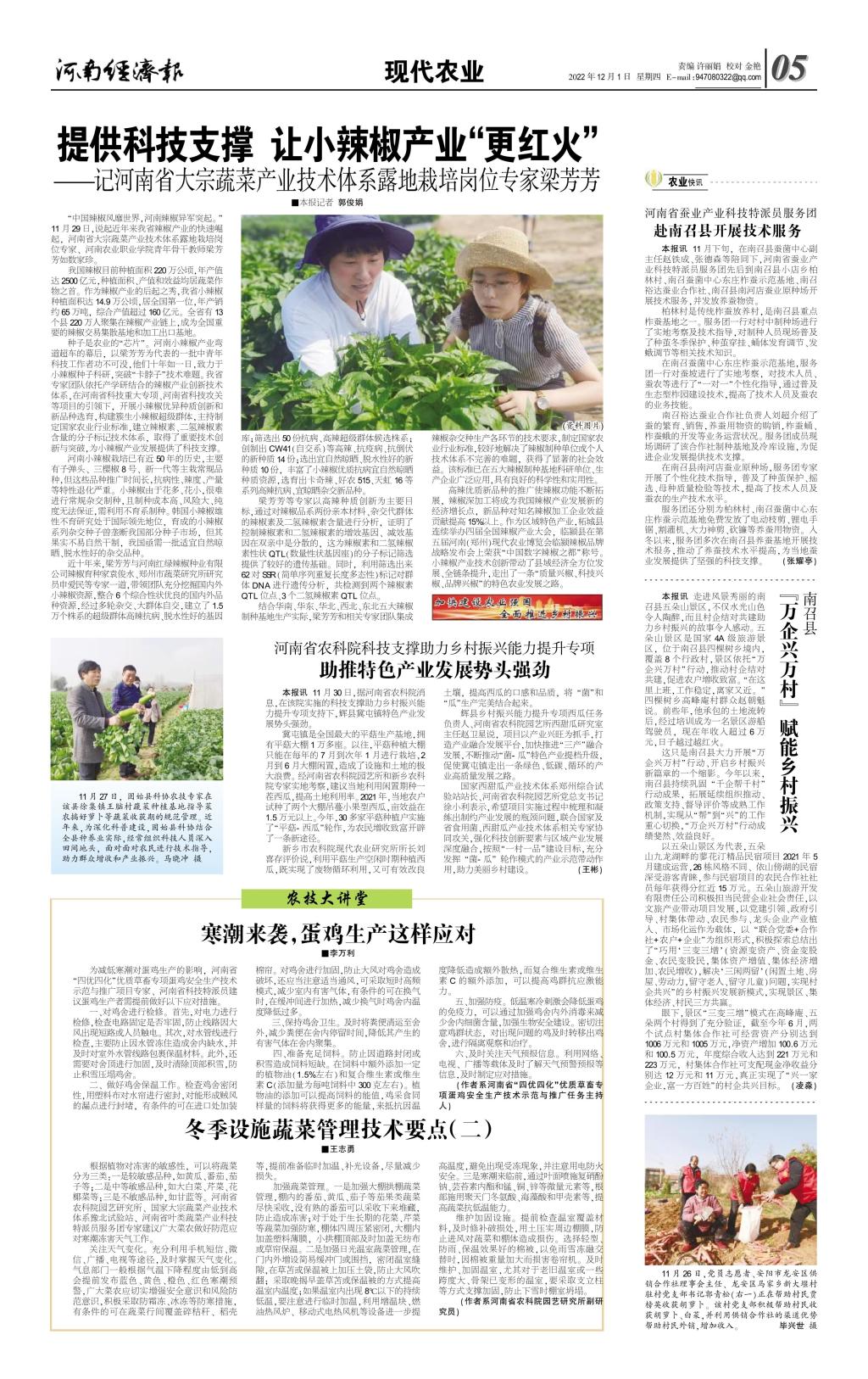 “中国辣椒风靡世界,河南辣椒异军突起。”11月29日,说起近年我省辣椒产业的快速崛起,河南省大宗蔬菜产业技术体系露地栽培岗位专家、河南农业职业学院青年骨干教师梁芳芳如数家珍。
