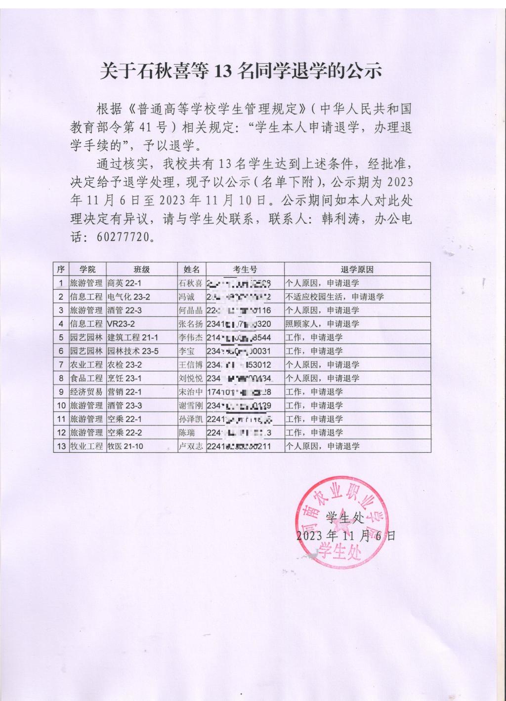 关于石秋喜等13名同学退学的公示