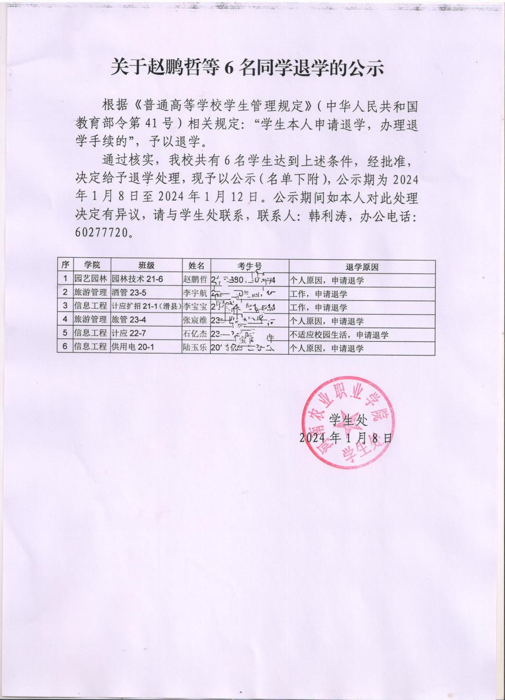 关于赵鹏哲等6名同学退学的公示