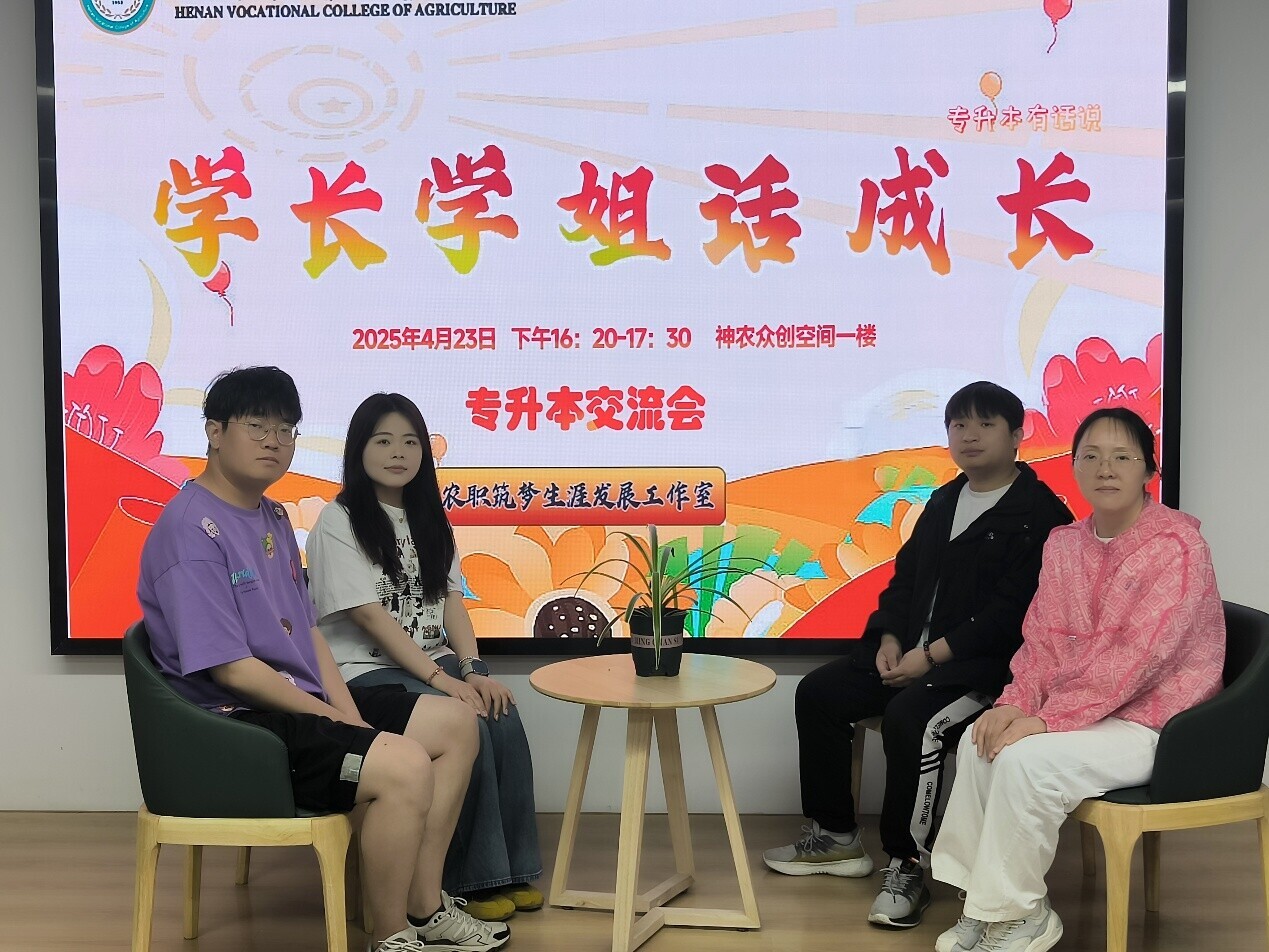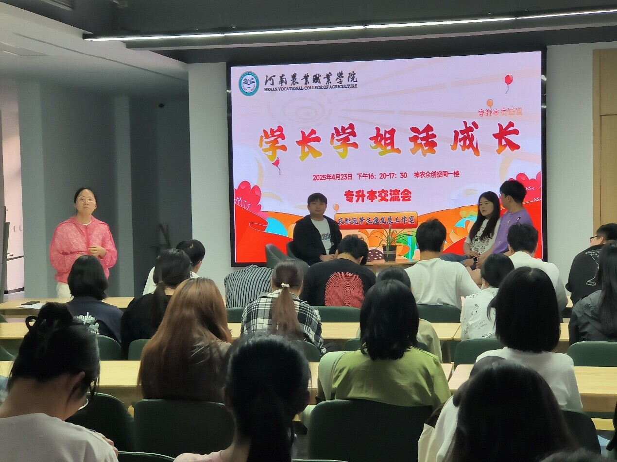 4 月 23 日,我校省级辅导员工作室 ——“农职筑梦” 生涯发展工作室成功举办 “逐梦升本・薪火相传” 专升本经验分享会,为备战专升本考试的在校生搭建起经验交流与学习提升的优质平台。本次分享会由工作室骨干成员韦孝歌老师主持,特邀三位优秀学长作为分享嘉宾,他们凭借自身丰富的专升本备考经验与卓越的学习成果,为参会同学带来了一场极具价值的知识盛宴。