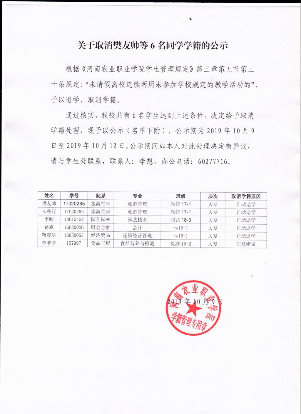 关于取消樊友帅等6名同学学籍的公示