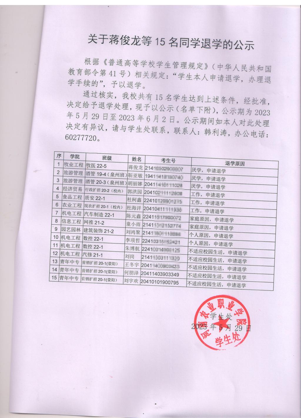 关于蒋俊龙等15名同学退学的公示