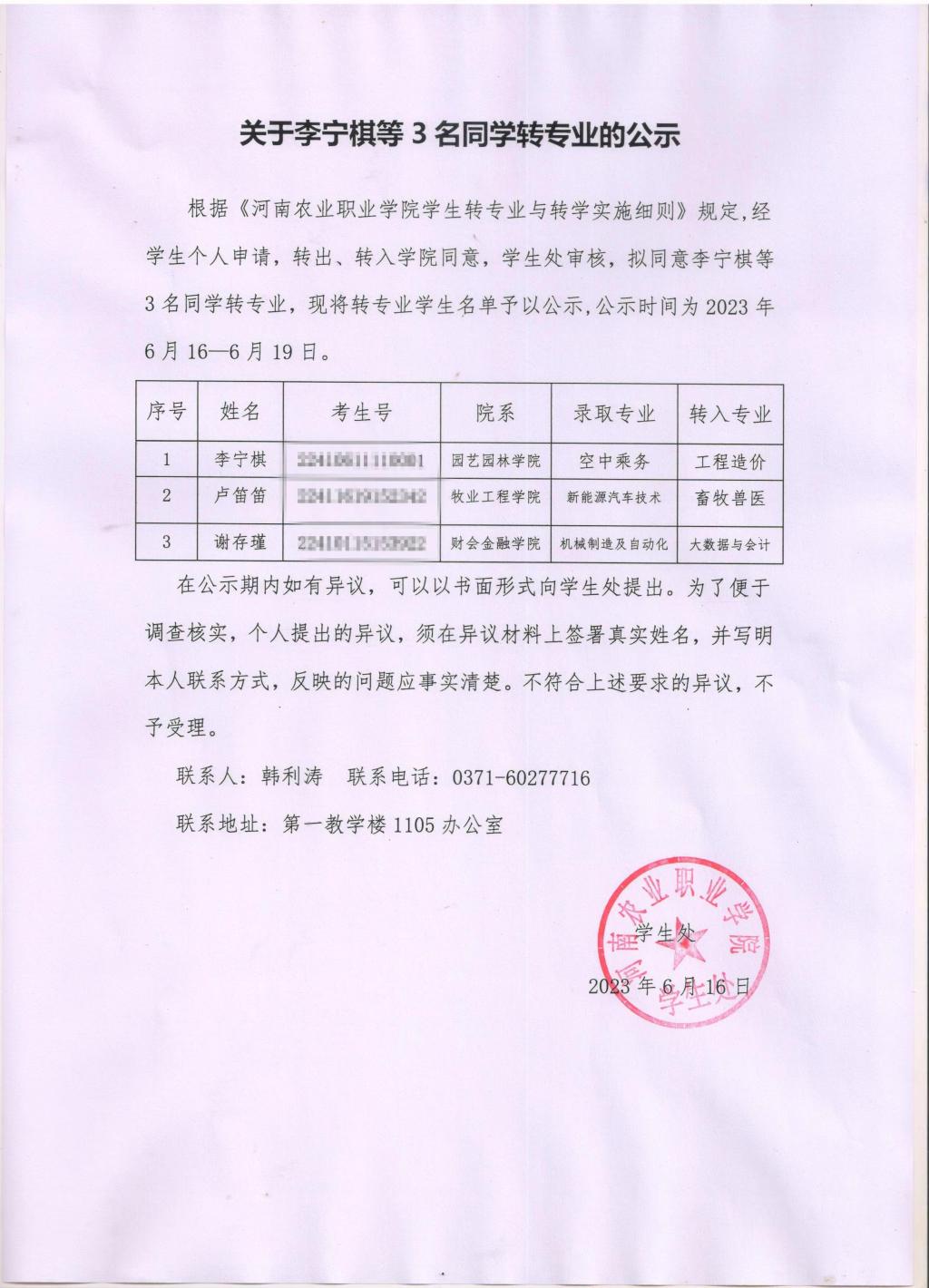 关于李宁棋等3名同学转专业的公示