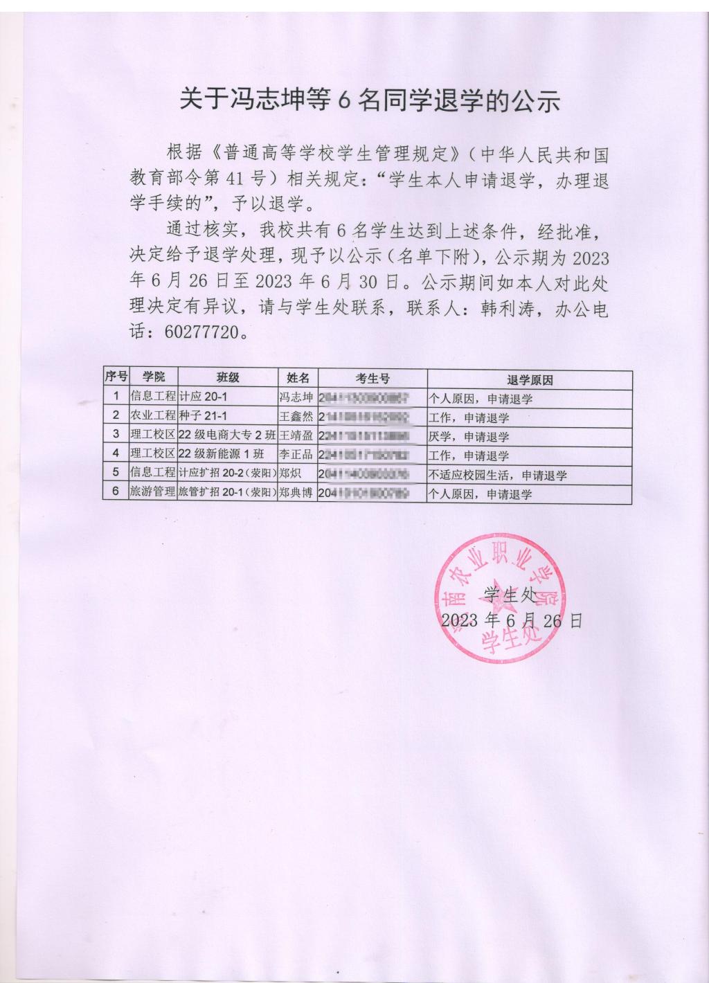 关于冯志坤等6名同学退学的公示