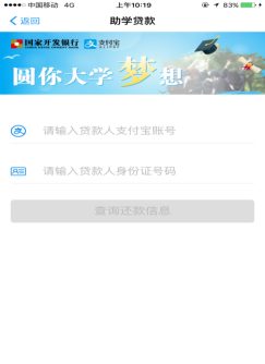(3)打开 “助学贷款还款”应用界面,点击“在线还款”,在弹出的还款界面内,输入还款学生的“还款支付宝账号”以及还款学生的“身份证号”,点击“查询还款信息”,核实信息无误后即可选择支付方式进行还款。