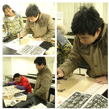 王铁钢老师在课堂上给学生们示范隶书的笔法