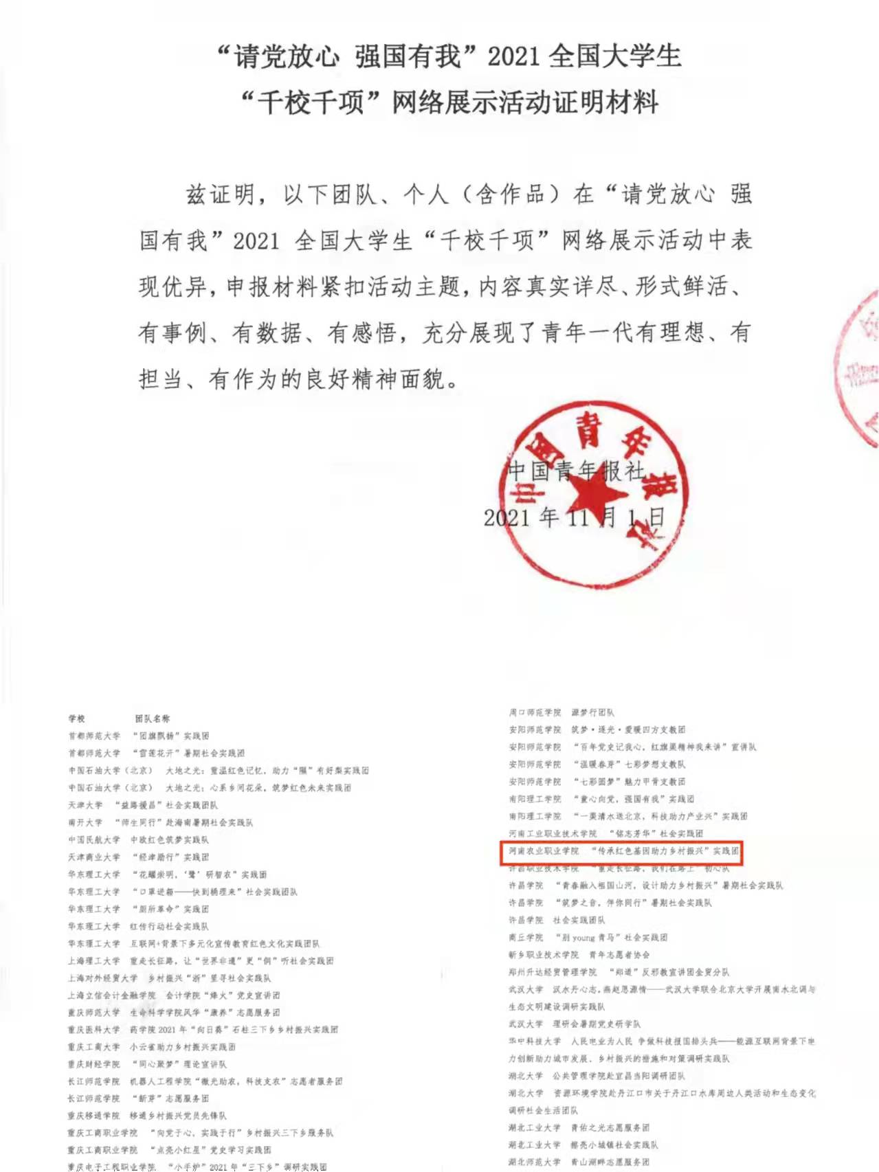 经过团队申报、活动展示、网络点赞、专家评选环节,“传承红色基因助力乡村振兴”实践团入选2021年全国大学“千校千项”网络展示活动团队风采获奖团队。