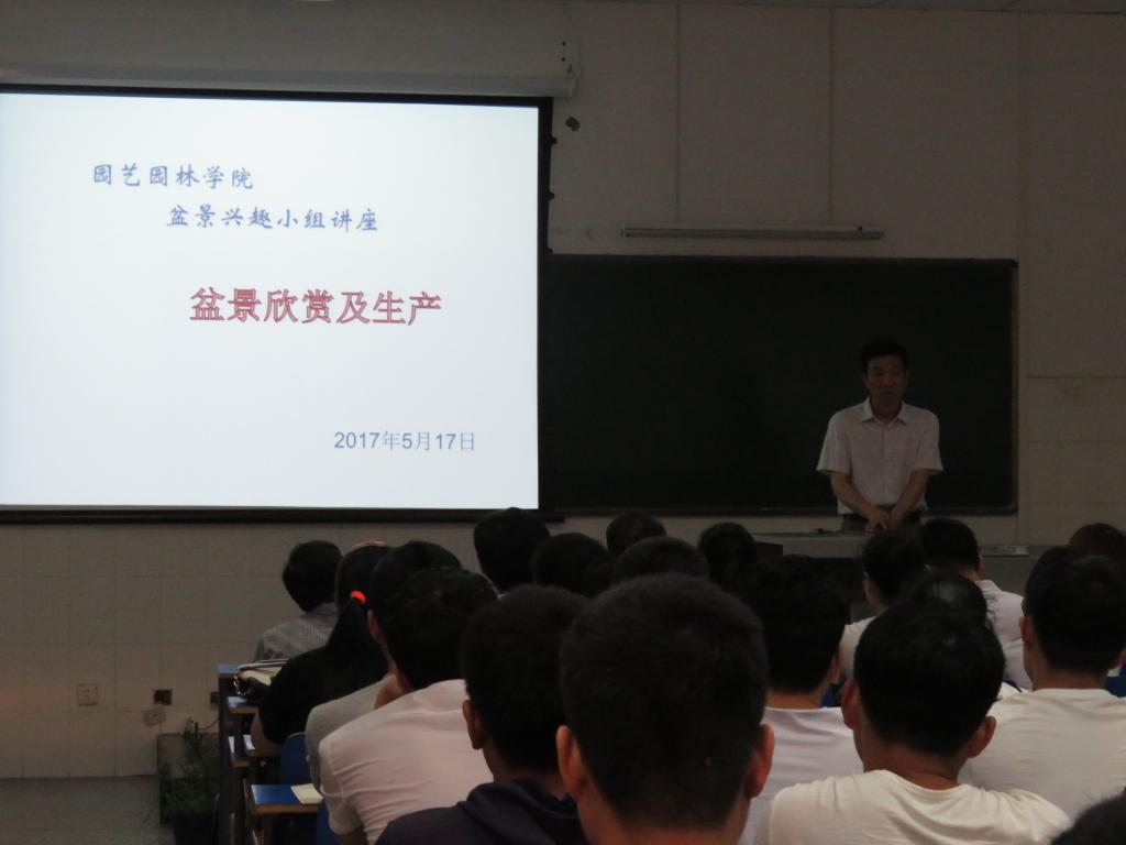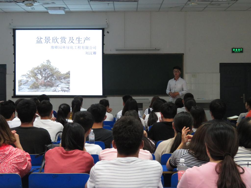 (通讯员张娜)5月17日下午,园艺园林学院邀请豫卿园林绿化工程有限公司的技术人员,在4106教室为学院盆景兴趣小组的70余位同学举办了一场“盆景欣赏与生产”讲座。学院院长常介田、副院长梁新安及部分专业教师参加了本次讲座。