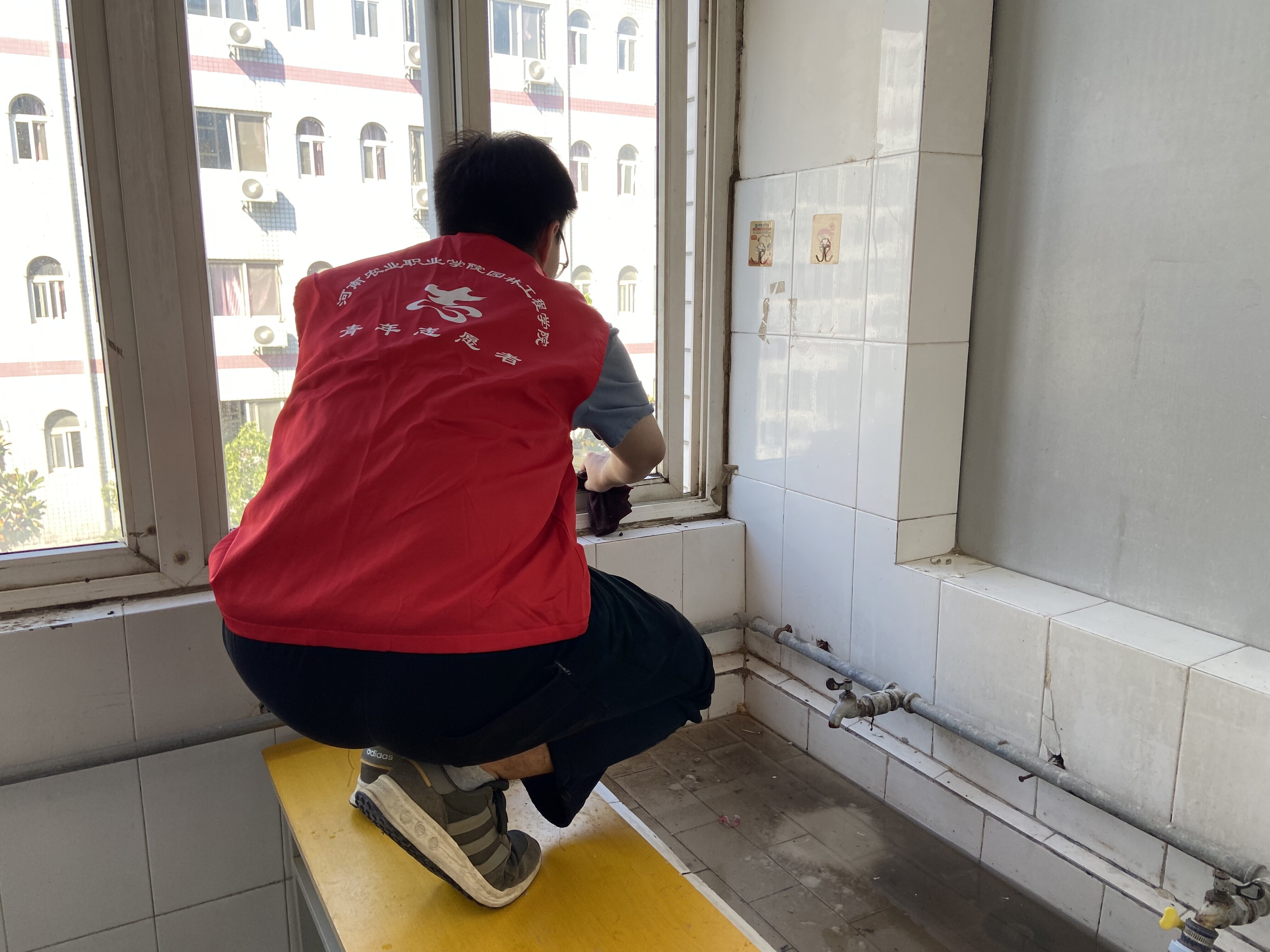 早在新生入学前,园林工程学院的青年志愿者们便积极行动起来,投身到宿舍清扫工作中。志愿者们身穿醒目的红色马甲,穿梭在各个新生宿舍。他们仔细打扫每一间宿舍,从地面的灰尘到窗户的污渍,从床架的清洁到卫生间的消毒,不放过任何一个角落。经过志愿者们的辛勤劳动,原本略显杂乱的宿舍变得干净整洁、焕然一新,为新生们提供了一个舒适温馨的居住环境。