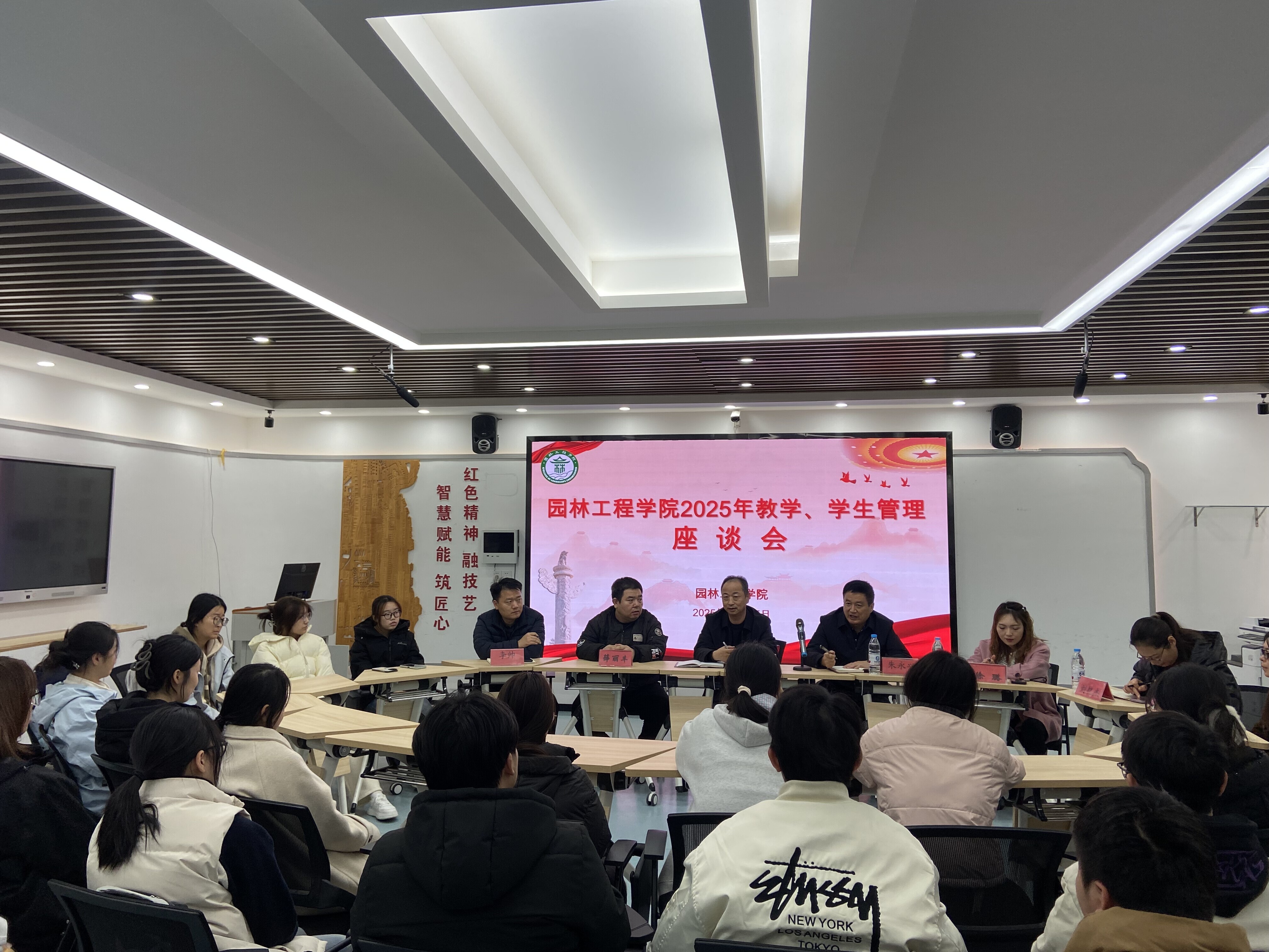11月25日,园林工程学院“2025年教学、学生管理座谈会”在3号教学楼3201教室顺利召开。园林工程学院院长朱永兴、党总支书记常启海、党总支副书记薛丽丰、团总支书记徐璐老师以及25届新生辅导员、任课老师和新生代表们围坐畅谈,共话成长。以轻松的形式,围绕学习、生活等实际问题展开深度交流。