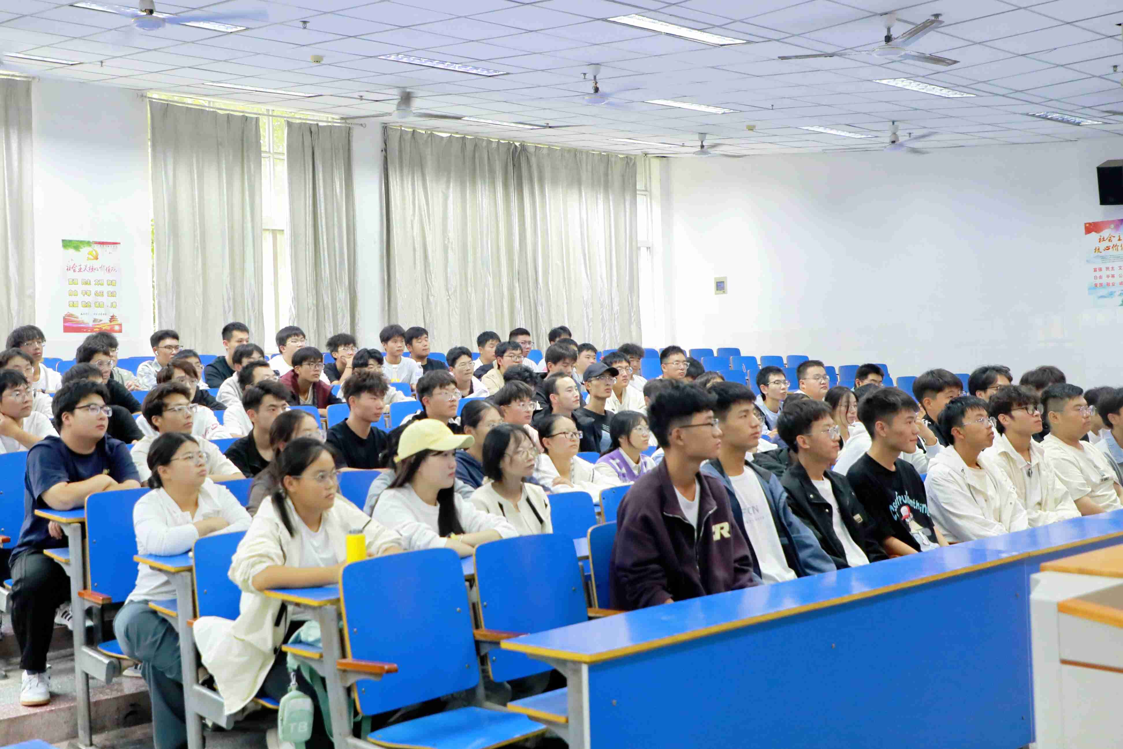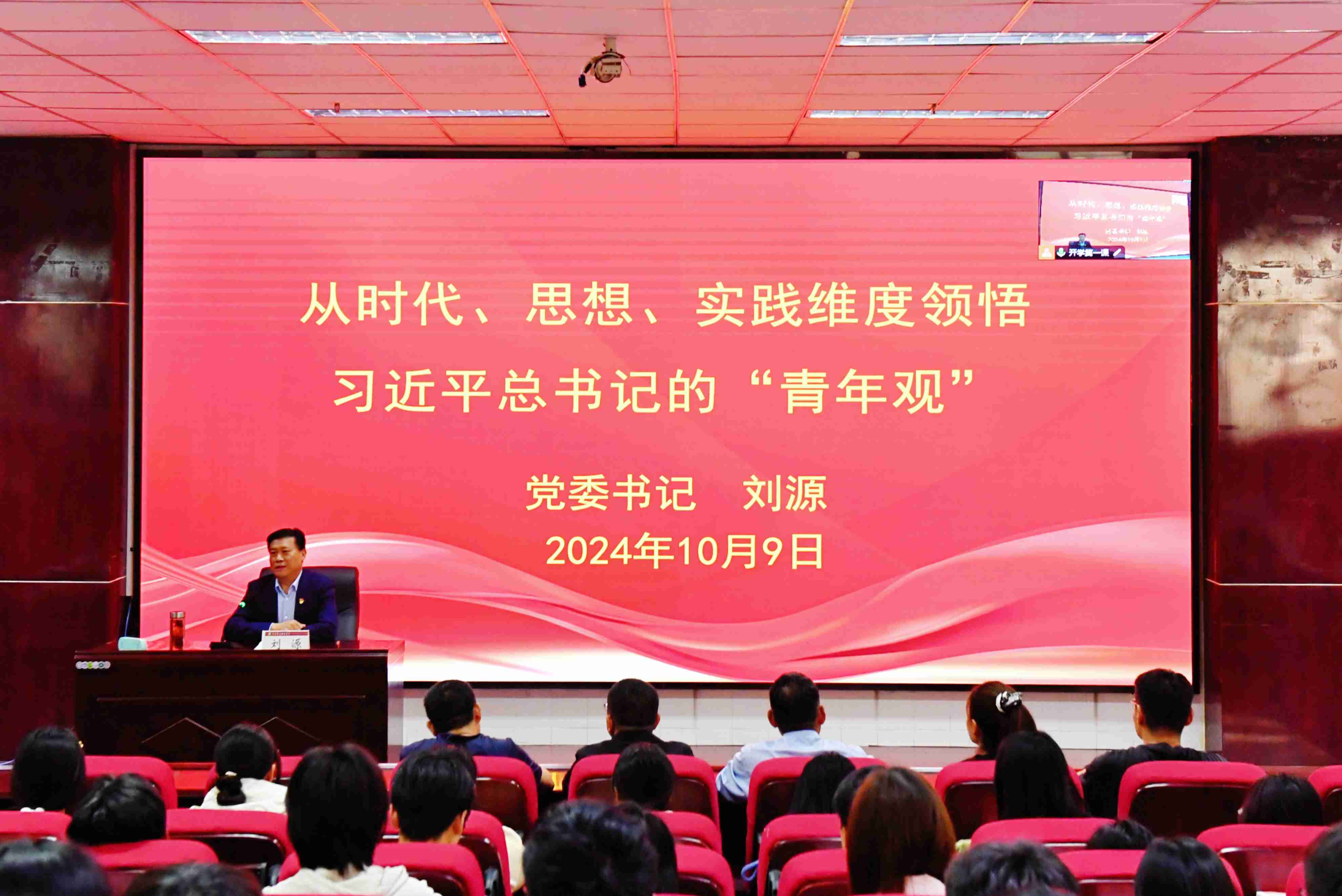 10月9日,学院党委书记刘源在4104报告厅为2024级新生讲授了以“从时代、思想、实践维度领悟习近平总书记的‘青年观’”为主题的开学思政第一课。活动由党委宣传部部长满曙光主持。