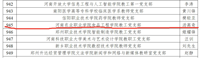 近日,教育部公布了全国高校“双带头人”教师党支部书记“强国行”专项行动团队名单,全国共有1486 名高校 “双带头人”教师党支部书记入选,其中高职高专院校305个,河南农业职业学院食品工程学院教工党支部成功入选。