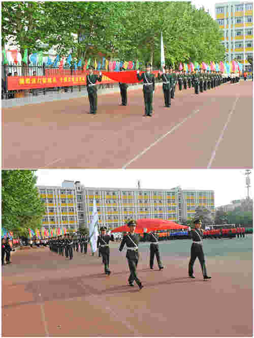 激扬的分列式进行曲奔腾着青春的热血,国旗班的“战士”们擎着五星红旗,护旗队员身着礼服,从主席台前昂扬走过。一个个方阵迈着铿锵有力的步伐,口号响亮的接受检阅。