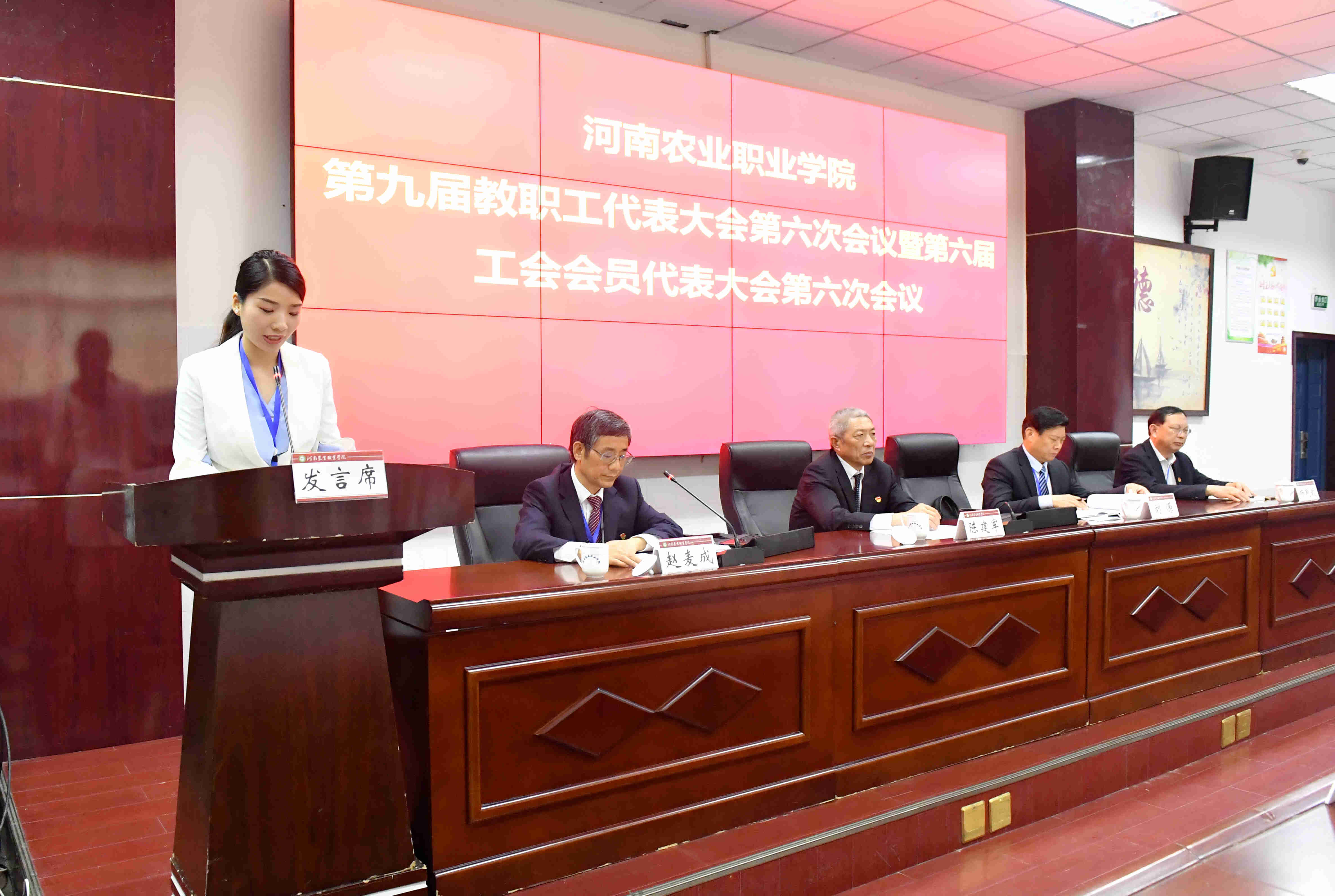 5月15日上午9时,河南农业职业学院第九届教职工代表大会暨第六届工会会员代表大会第六次会议在4104报告厅开幕。学校领导班子成员出席会议。与会代表应到137人,实到128人。开幕式由学校党委副书记、工会主席赵麦成主持。