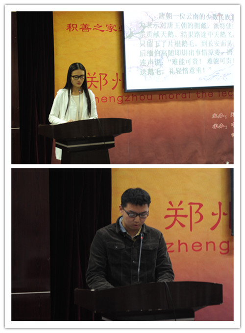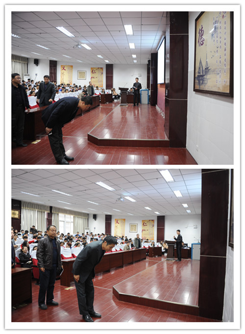 本次道德讲堂以“文明礼貌”为主题,分自省、唱歌曲、看短片、诵经典、讲故事、谈感悟、写感言和送吉祥八个环节。伴随着优美的音乐,主持人以开场三问拉开报告会的序幕;与会师生齐唱“感恩的心”,在歌声中净化心灵;在看短片环节中,播放了我院学生制作的文明礼貌短片,传递了“文明从身边做起,从小事做起”的文明感言;接着在主持人的带领下,与会师生诵读了文明礼仪三字经,感悟经典;在讲故事环节,我院学生代表讲述了“千里送鹅毛”的故事;在谈感悟环节,学生代表从自身说起,谈了对文明礼貌的感悟;